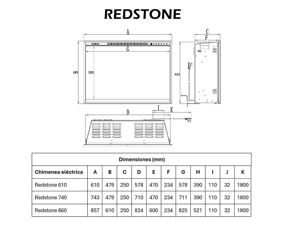 El Redstone es un insert eléctrico decorativo diseñado para aportar el efecto visual de una chimenea moderna con la comodidad, limpieza y seguridad de la tecnología eléctrica. Pensado para instalación empotrada o como insert en hogares existentes, permite transformar cualquier espacio en un punto focal elegante y contemporáneo.