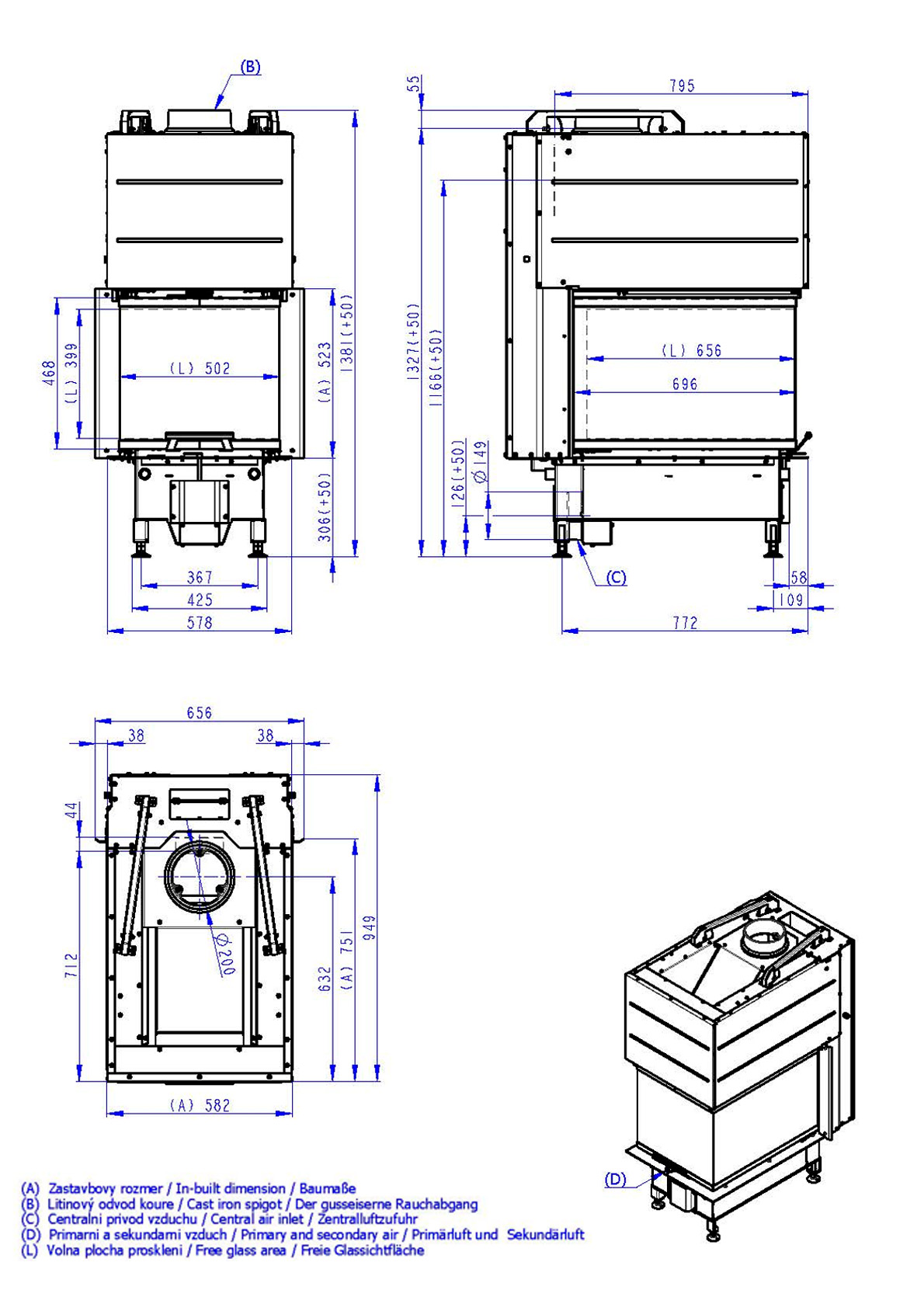 Chimenea de leña de triple cara tipo Room divider modelo RD3G 50/47 de la firma checa Romotop. Montaje efectuado por nuestro distribuidor oficial de Pontevedra Goncer chimeneas.