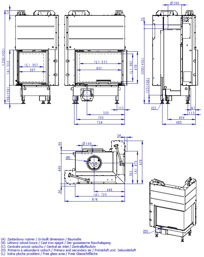 El acristalamiento de las esquinas (izquierda, derecha) consta de dos piezas. El funcionamiento sencillo, silencioso y preciso de la puerta levadiza está garantizado por el vanguardista sistema SILENT LIFT. La cámara de combustión está revestida con ladrillos resistentes al calor IGNITON o con ladrillos de chamota negra y está diseñada sin rejilla de horno. Sin embargo, el inserto puede equiparse con rejilla a petición del cliente. Los insertos para chimenea HEAT están diseñados para funcionar por convección. El innovador sistema de escape de humos DOUBLE SPIN aumenta la eficiencia y reduce el impacto ambiental del inserto. La entrada de aire secundario se realiza a través del cristal de la puerta para evitar la acumulación de depósitos. La entrada de aire primario y secundario se regula mediante un único elemento de control. Se incluye un sistema EAI (entrada de aire externo). El aire terciario se introduce en la cámara de combustión para maximizar la eficiencia de la combustión. Los juegos de acumulación MAMMOTH laterales y superiores se pueden comprar por separado para insertos de chimenea, lo que puede extender el período de radiación de calor en más de 12 horas.