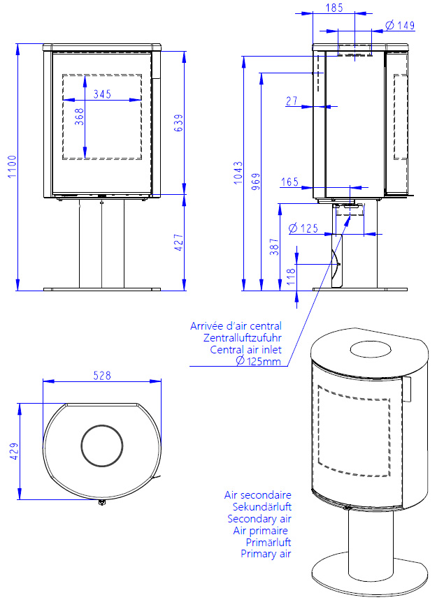 La Kelio está disponible con una base redonda y una placa para los pies que sigue el diseño de la estufa. También está disponible con un compartimento para guardar leña, que, por supuesto, también sigue el diseño de la estufa.