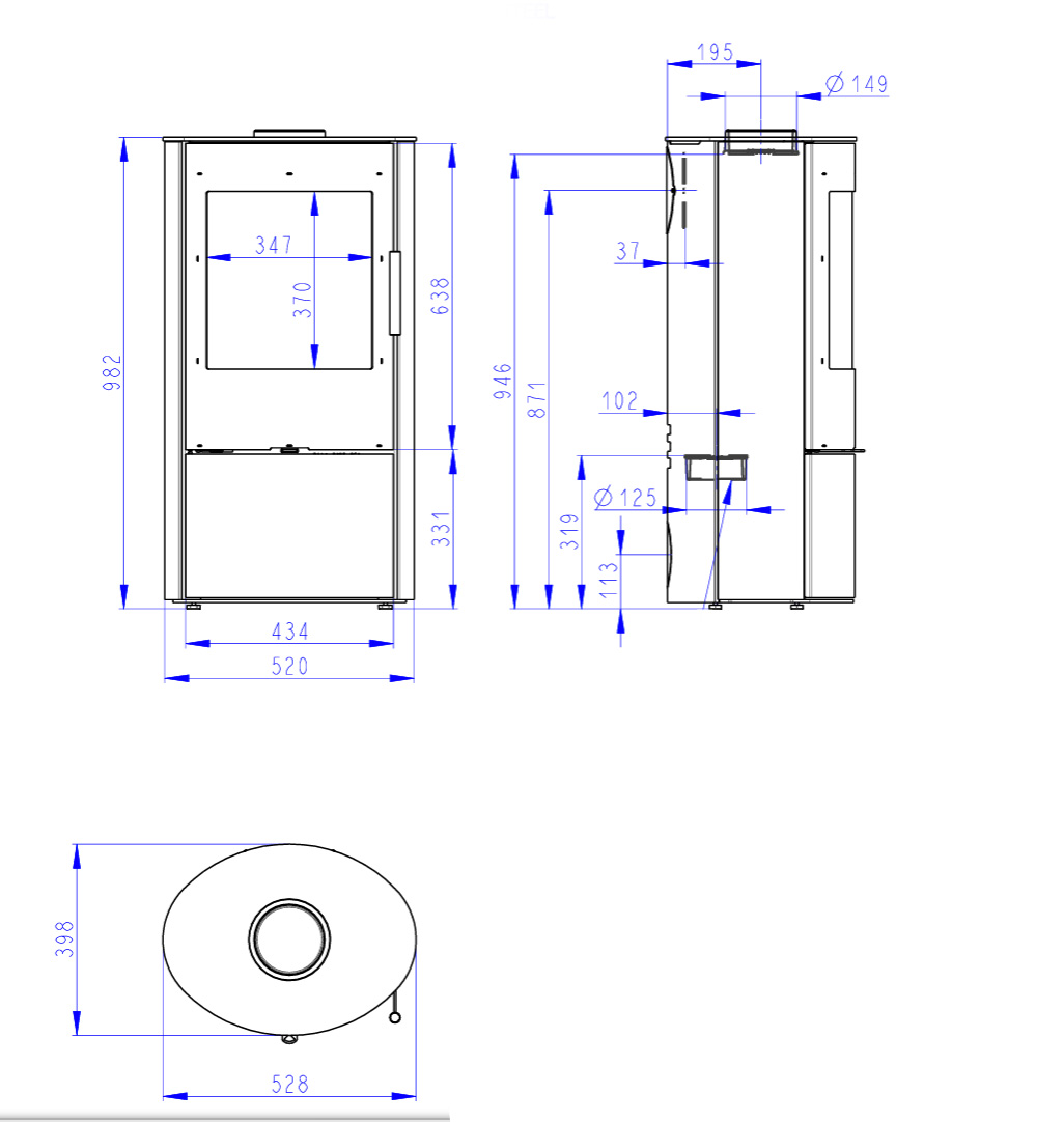 Esta estufa de leña es apta para hogares de bajo consumo energético. Incluye un sistema EAI (Admisión de Aire Externo). La versión estándar incluye la opción de conectar un extractor de humos superior o trasero. Gracias a la admisión de aire secundario, el cristal de la puerta se limpia con aire para evitar la acumulación de hollín. La cámara de combustión está revestida con cerámica keramott. Las entradas de aire primario y secundario se regulan mediante un único elemento de control. La parte inferior de la estufa incluye un compartimento con puerta para guardar leña o herramientas.