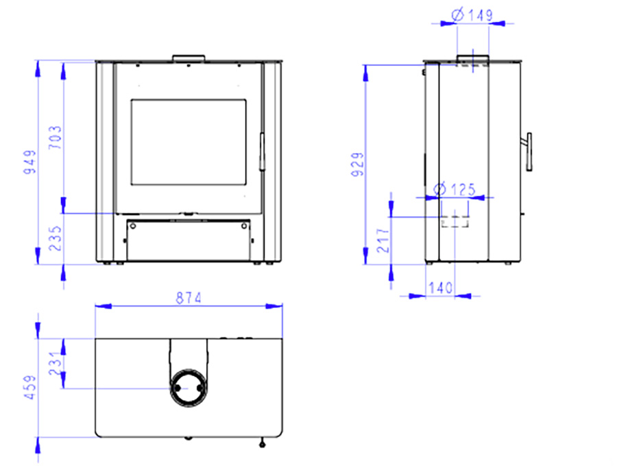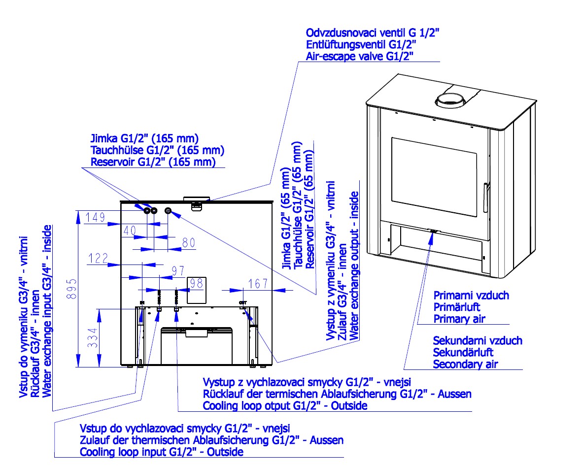 La puerta de doble acristalamiento evita eficazmente el sobrecalentamiento de la estancia. La estufa cuenta con un sistema EAI (suministro externo de aire exterior). La salida de humos se realiza a través del conducto superior. El sistema de aire precalentado evita que el cristal se ensucie. La cámara de combustión está revestida con ladrillos de arcilla escamosa. El suministro de aire primario y secundario se controla mediante un único elemento de control.