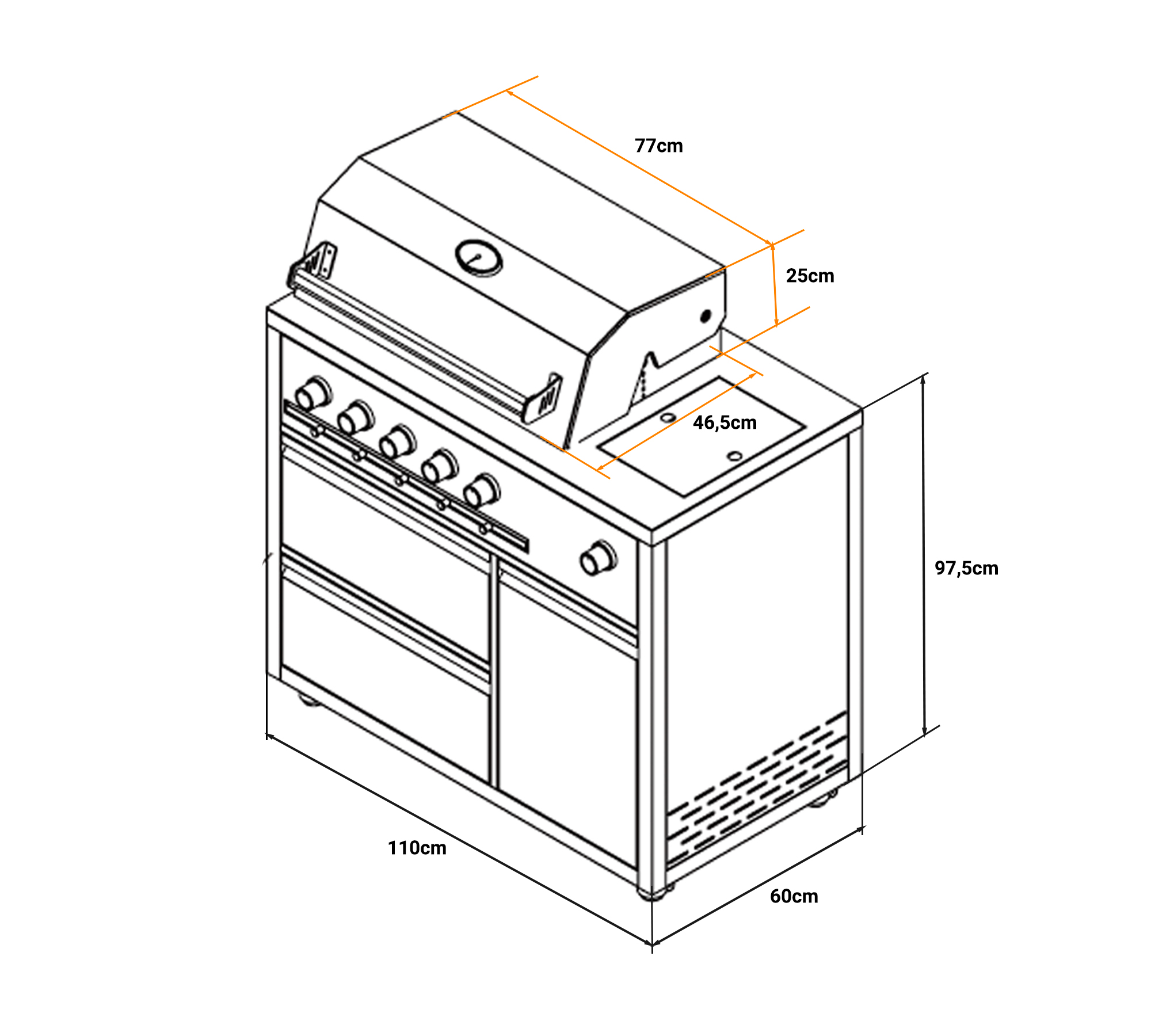 Módulo barbacoa para cocina de exterior serie BONNIE, el top fabricado con acero inoxidable 304 y las placas de cubrimiento de acero inoxidable 403, tratadas con varias capas de pintura en polvo para aumentar su protección en el exterior.
