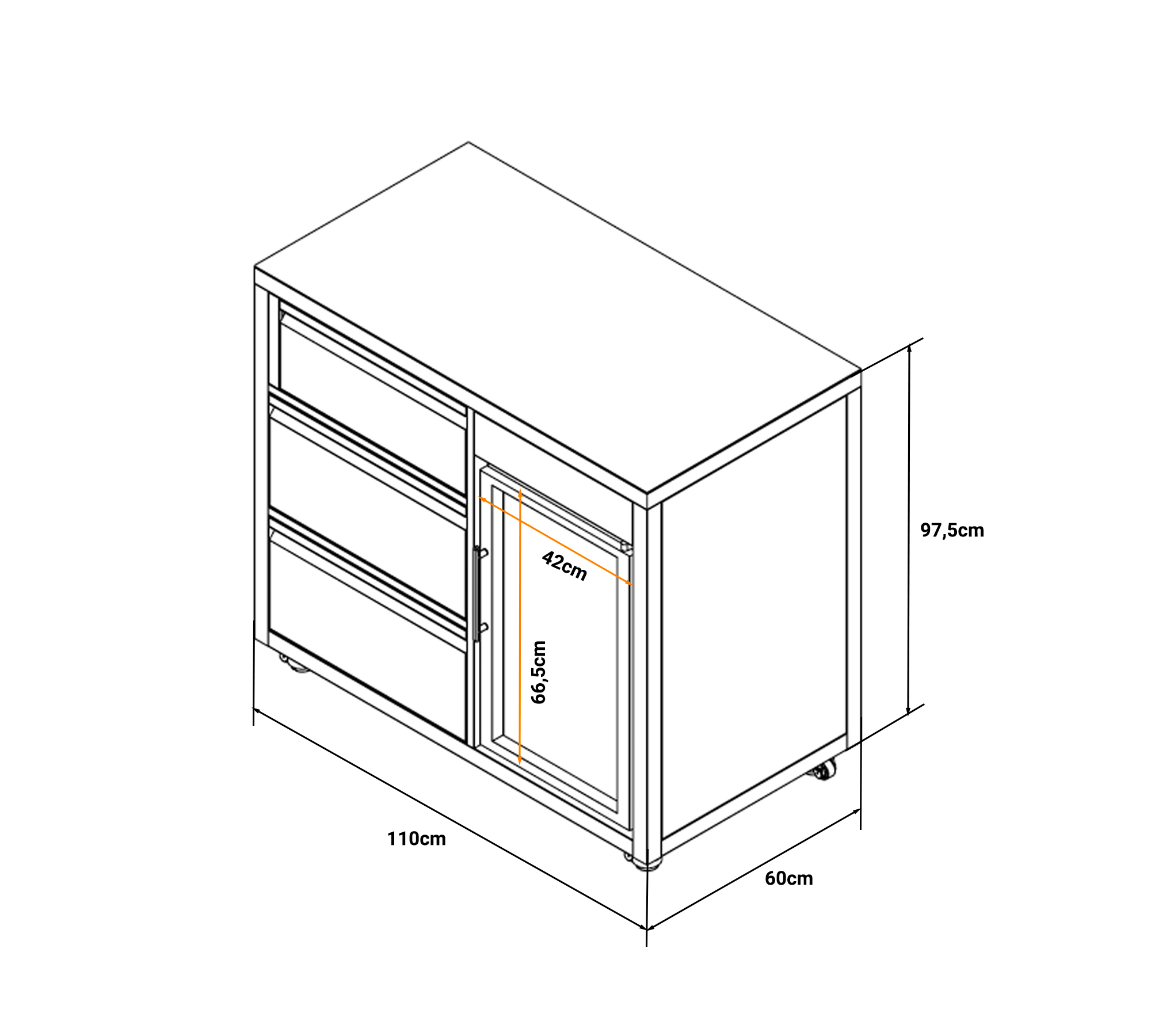 La encimera es de acero inox. 304 para una perfecta durabilidad en espacios exteriores, los recubrimientos fabricados con acero inox. 403 con varias capas de pintura en polvo cocida a alta temperatura. Esto nos ofrece una alta durabilidad en oscilaciones térmicas importantes y abrasión solar.